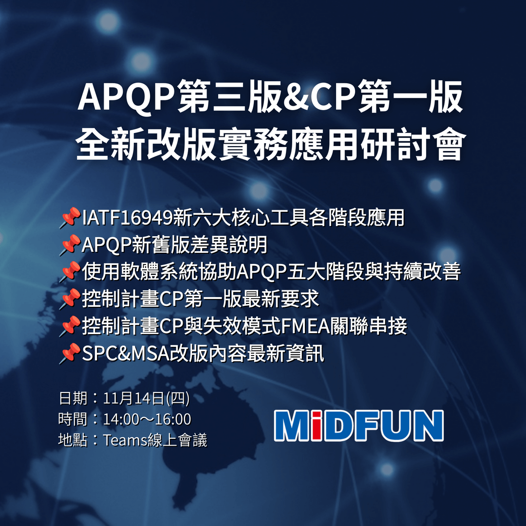 最近數年IATF16949第三方驗證缺失排行榜-CP控制計畫一值高居前五大,加上自動化工廠與電動車技術趨勢,AIAG將CP從APQP手冊當中分離出來,成為單獨的參考手冊,透過更詳細的說明與規範,協助各家車廠完成控制計畫。而中方身為國內品質軟體系統廠商,將在本次研討會為各位說明APQP&CP新舊版差異,怎麼導入系統協助管理,以及對應改版我們已經做了哪些調整,歡迎舊雨新知一起來共襄盛舉,交流經驗。