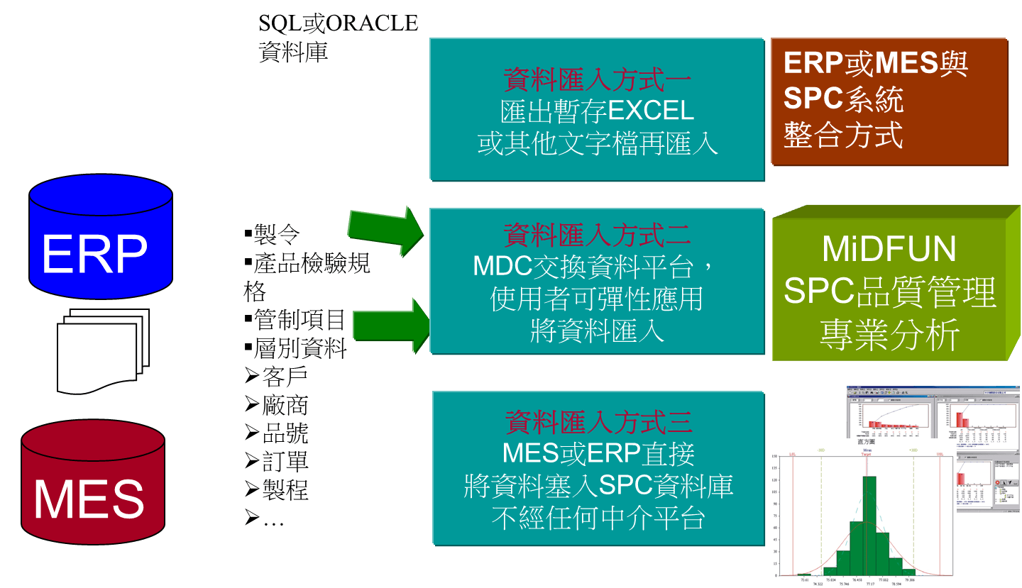 A:MDC(Manufacturing Data Collection)是中方科技提供的中介資料交換平台,負責串接工廠內不同系統之間的品質數據。MDC 支援三種資料匯入方式:從 ERP 匯出 Excel 再匯入、透過 MDC 平台彈性交換、或由 MES/ERP 直接寫入 SPC 資料庫。企業可依照現有資訊架構選擇最適合的整合方式,實現品質數據自動化採集與跨系統共享。