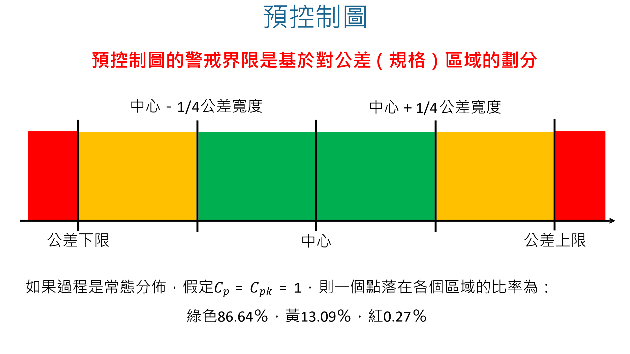 預控制圖的警戒界限劃分:綠區(目標區)佔公差中間 50%,黃區(警戒區)各佔 25%,紅區(不良區)超出規格界限。